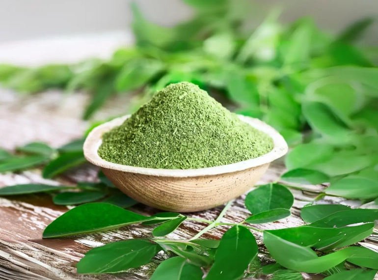 Powder Moringa Powder Nutrient-rich Moringa leaves, finely milled, vitamin-packed, used in supplements, wellness blends, skincare.